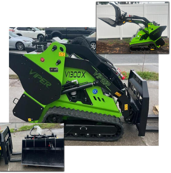 The Viper loader has an operating capacity of 1300lbs. Ideal width of 44" allows machine to work in smaller spaces while maintaining a light foot print. Options include: Bucket, Grabble, Tree Boom and Forks.